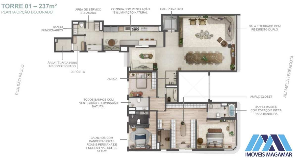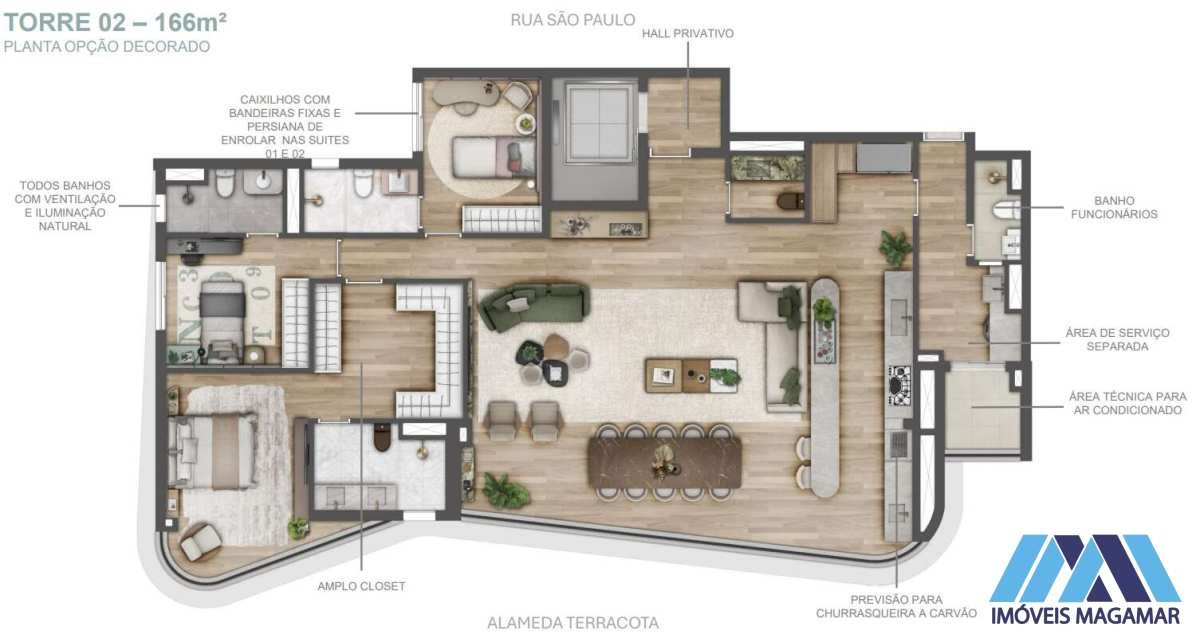 Planta B 166–171 m² 3 suítes ou 4 dorms (2 suítes) 3 vagas + depósito Planta versátil, varanda maior, ideal para famílias