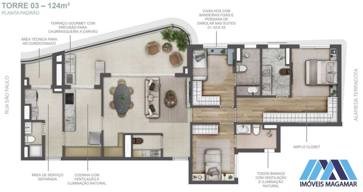 Planta A 122–125 m² 3 suítes 2 vagas + depósito menor Varanda gourmet, living integrado, opção mais acessível