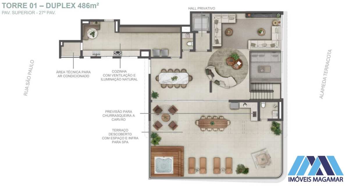 Plantas duplex com terraço e áreas sociais integradas. Opção de personalização (piscina, gourmet, escritório). 4–5 vagas.